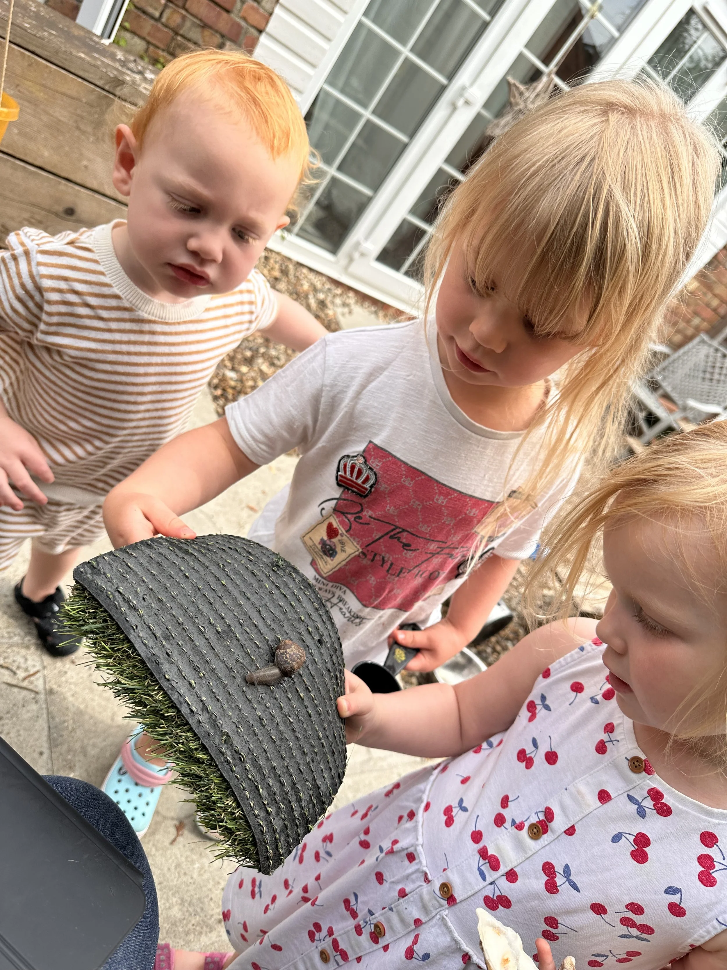 We found more rainwater in the scale buckets and used it to make tea to go with our soup. We also found a snail in the garden, we were worried that he might be getting too hot so we moved him to a nice shady area of the grass.