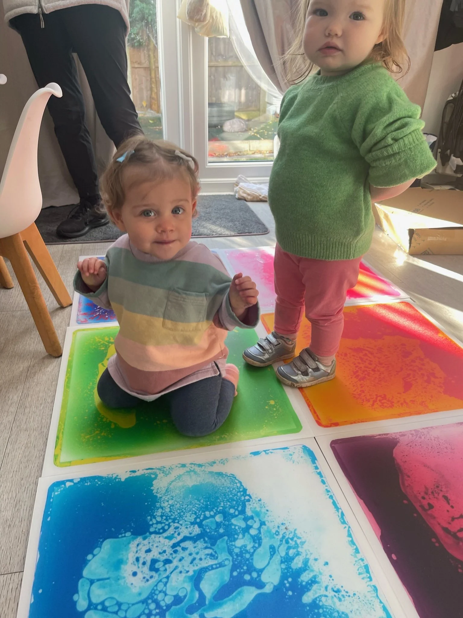 Meanwhile, the little ones explored the sensory tiles. We walked, crawled and shuffled across the tiles and watched the colourful gel move underneath us.